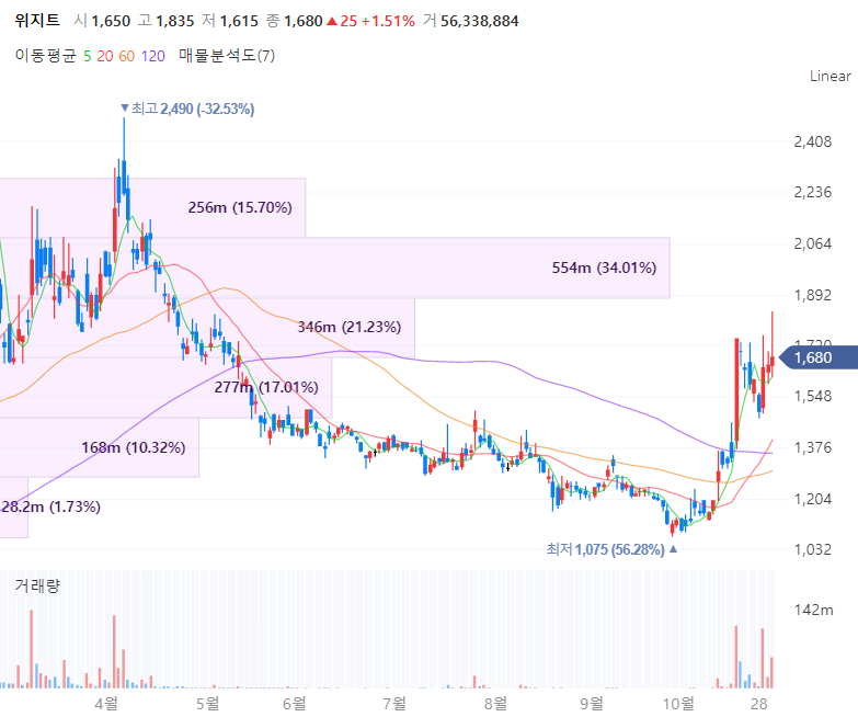 위지트는 계측기기 제조 및 판매를 영위할 목적으로 1997년 2월 설립된 회사로 디스플레이 및 반도체장비 부품을 생산 및 판매하고 있습니다. 디스플레이 소모성 부품인 상부전극의 국산화에 성공했으며 LG디스플레이, 삼성디스플레이, SK하이닉스 및 해외 BOE, HKC 등 국내외 주요회사에 납품하고 있으며 위지트는 빗썸 지분을 보유한 티사이언티픽의 최대주주입니다.