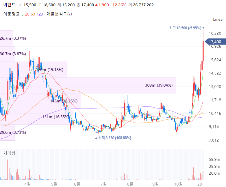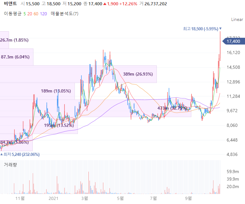 비덴트는 방송용 디스플레이 전문업체로 Tvlogic America. co., Ltd와 넥스토디아이 2개 회사를 연결대상 자회사로 둡니다. 비덴트는 가상화폐 거래소 빗썸의 단일 최대주주로 빗썸 운영사 빗썸코리아 10.25%, 지주사 빗썸홀딩스 34.22% 지분을 보유하며 부각받고 있습니다. 빗썸이 상반기 누적 순이익 6033억을 기록하며 투자사인 비덴트 역시 상반기 순익이 1374억원으로 전년 동기 112억원 대비 약 1084% 대폭 증가하는 어닝서프라이즈를 기록중이빈다.