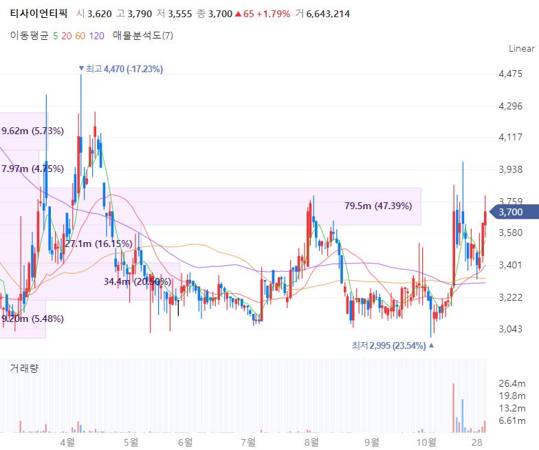 티사이언티픽은 1998년 설립됐으며 모바일 쿠폰 발행, 인증, 결제 등을 위한 소프트웨어와 하드웨어를 제공하는 것을 주요 사업으로 영위합니다. 티사이언티픽의 매출구성은 모바일 커머스 판매 39.38%, 모바일 커머스 SI 용역 60.62%으로 이루어지며 동사는 빗썸의 운영사인 빗썸코리아의 지분 8.23% 보유하고 있으며 투자이익으로 이미 시총을 뛰어넘었습니다. 아울러 코인스탁의 지분 33%를 취득하며 암호화폐 거래소 사업을 추진중이라는 점이 부각받습니다.
