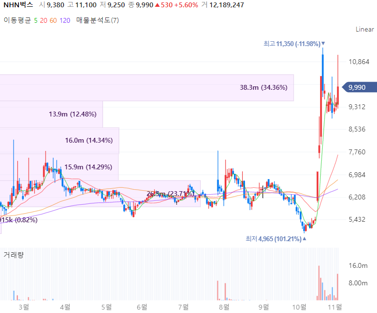NHN벅스는 온라인 음원서비스 및 음원유통 전문 회사로 싸이월드의 대표적인 서비스인 미니홈피 BGM 서비스 구축했습니다. 최근 싸이월드 시장 가치가 약 3조6000억원에 달할 것 분석이 나오며 NHN벅스가 부각받고 있습니다. 아울러 NHN벅스는 지난해 기업간거래(B2B) 음원유통 및 매니지먼트 매출로 260억원을 달성했으며 추후 사업이 재개될 시 실적이 크게 상승할 것으로 보입니다.