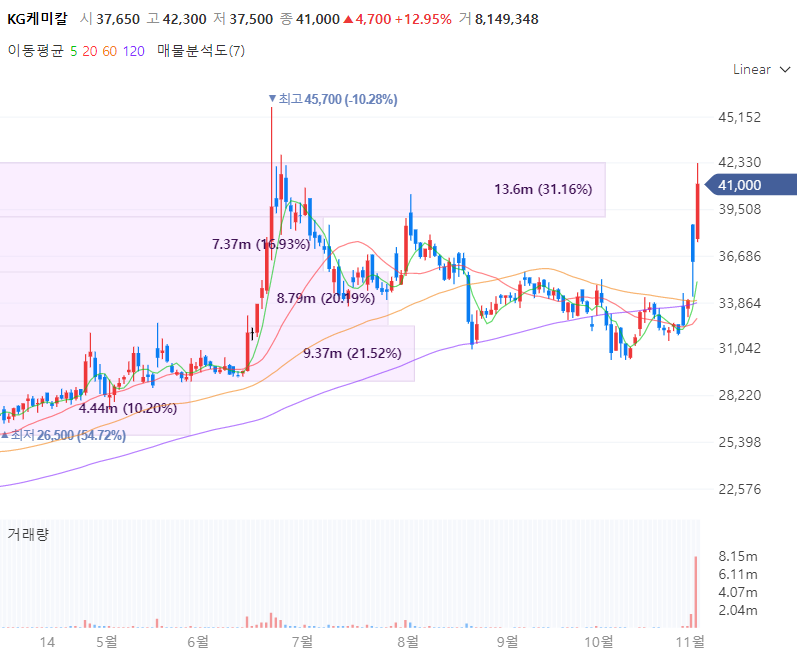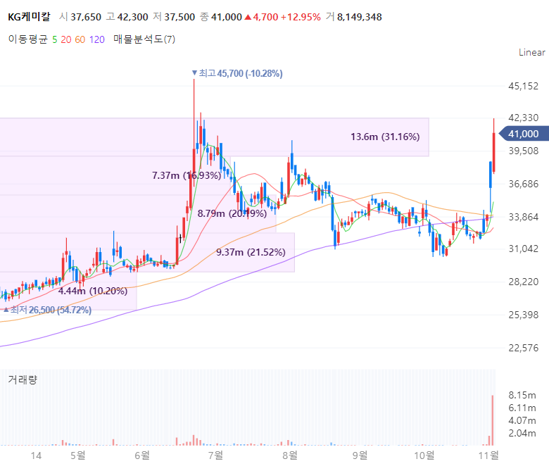 KG케미칼은 1954년에 설립되었으며 건설소재와 비료의 제조 및 판매를 주사업으로 합니다. 특히 감수제, 유지제, 혼화제 등 건설관련 화학소재사업과 친환경 유기질비료, 천연성분 작물보호제, 미생물 제재, 친환경 농자재 등의 생명농업사업을 전개하고 있습니다, 아울러 KG케미칼은 에너지, 전자결제, 미디어 및 금융, 교육사업, 요식업, 기타부문의 7개 종속회사를 보유합니다. 또한 차량용 요소수 '녹스-K' 판매에 따라 가격 전가에 따른 수혜가 기대됩니다.