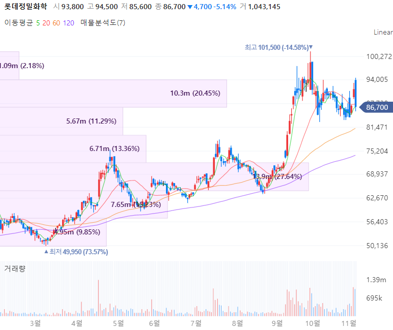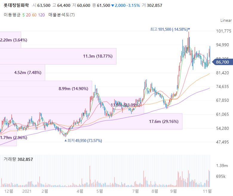 롯데정밀화학은 1964년에 설립됐으며 정밀화학제품, 일반화학제품, 전자재료제품 등을 생산하며 공급하고 있으며 국내 암모니아 유통의 70%를 담당하는 생산 인프라를 보유하고 있습니다. 올해 롯데정밀화학의 3분기 매출은 4,921억원, 영업이익은 702억원 기록했으며 4분기에도 가성소다 및 에폭시 부원료인 ECH의 강세로 호실적이 전망되고 있으며 올 2분기 매출에서 암모니아가 차지하는 비중은 41.6%에 달했습니다.