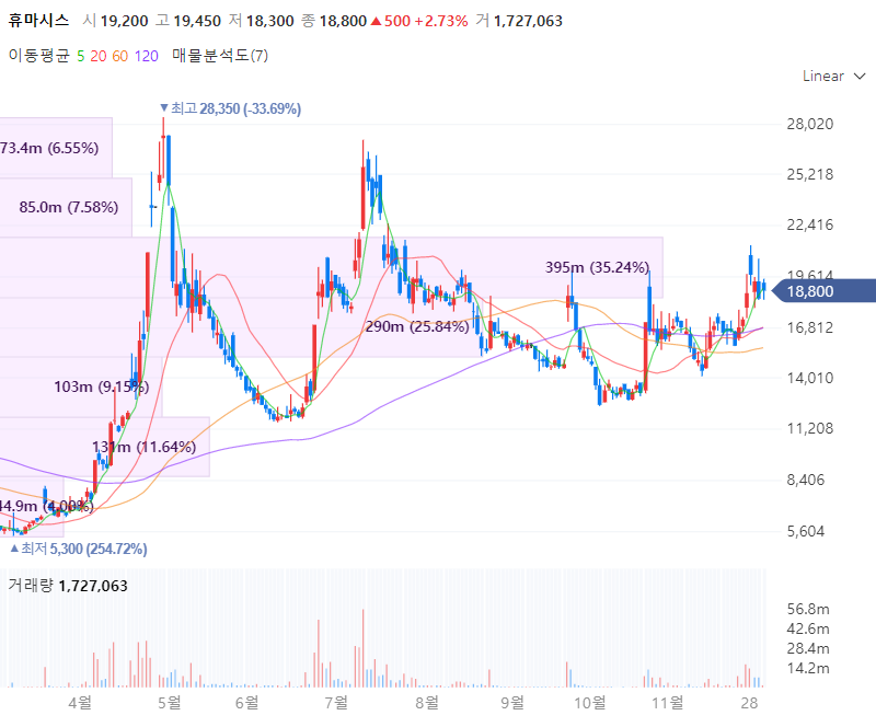 휴마시스는 체외진단 의료기기 생산기업으로 2000년 설립됐습니다. 주력 제품으로 산부인과,심혈관,감염성,암 질환 등에 사용되는 POCT 자동면역분석장비를 보유하며 면역 분석시약, POCT 면역정량분석기기, 신규마커등 도 개발진행중입니다. 휴마시스의 실적을 살펴보면 연결 기준 3분기 영업이익이 전년 동기 대비 7925.97%, 매출액은 전년 동기 대비 2515.55% 대폭 상승했습니다. 아울러 휴마시스와 셀트리온이 공동개발한 자가검사키트가 10월 미국 FDA로부터 긴급사용승인을 받으며 현재 독점 생산을 맡고 있습니다.