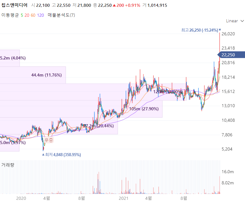칩스앤미디어는 2003년 3월 설립됐으며 반도체 설계자산 업체로 반도체 IP 가운데 비디오 IP 사업을 주력으로 영위합니다. 칩스앤미디어는 차량용 반도체 업체 NXP에 동영상 코덱 기술 공급하였고, 모빌아이에 설계자산을 공급하면서 자율주행 칩 시장으로 보폭을 넓히고 있습니다. 모빌아이와 협업한 실적을 바탕으로 향후 구글이 자율주행 자회사 웨이모를 통해 추진하는 ‘구글카 프로젝트’에도 참여할 것으로 예상되며 크게 재평가 받고 있습니다.