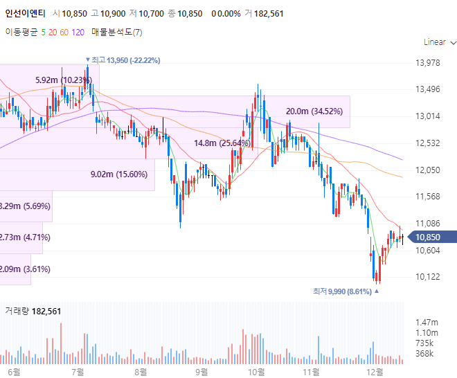 인선이엔티는 건설폐기물의 수집,운반 및 중간처리업을 목적으로 설립되어 7개 자회사를 둡니다. 인선이엔티는 비계구조물 해체에서부터 건설폐기물의 수집 및 운반, 처리, 순환골재 생산, 폐기물의 최종처분까까지 국내 유일한 폐기물 일괄처리 기술 및 특허를 보유하고 있습니다. 아울러 폐배터리 사업에도 진출해있으며, 새해부터 수도권 건설 폐기물 반입수수료가 올해 대비 47.7% 증가한 14만8270원으로 상승하며 이에따라 마진율이 오를 전망입니다.