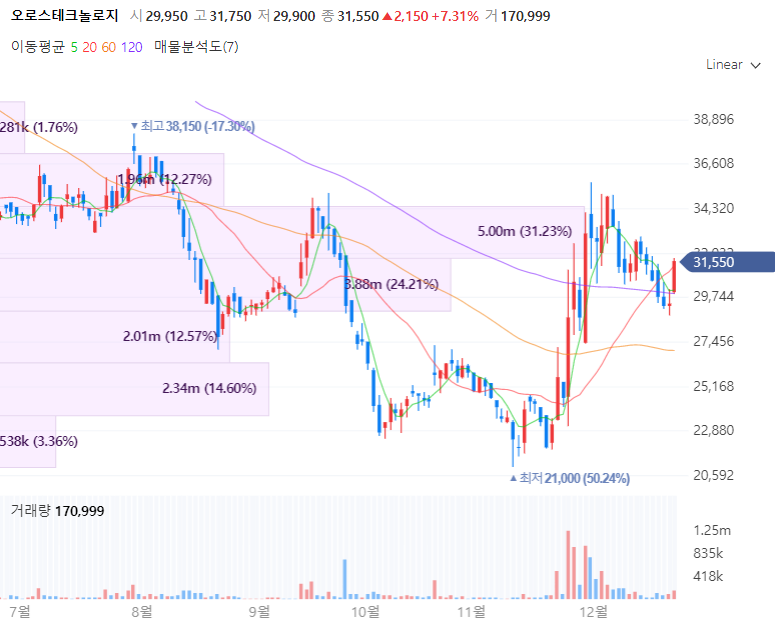 오로스테크놀로지는 반도체 웨이퍼의 MI(Overlay Metrology, Inspection) 장비 제조를 전문으로 하는 기업입니다. 오로스테크놀로지는 2011년 국내 최초로 Overlay 계측 장비 국산화에 성공했으며 이후 고성능 AF System 등 다수의 핵심 기술들을 꾸준히 개발하고 있으며 지난 17일 SK하이닉스에 23억원어치 장비 공급계약을 하는 등 활발히 사업을 영위중입니다. 동사는 반도체 제조공정에서 증착되는 박막의 두께를 Angstrom 단위의 정밀도 까지 측정가능한 초정밀 계측장치를 신규로 개발중입니다.