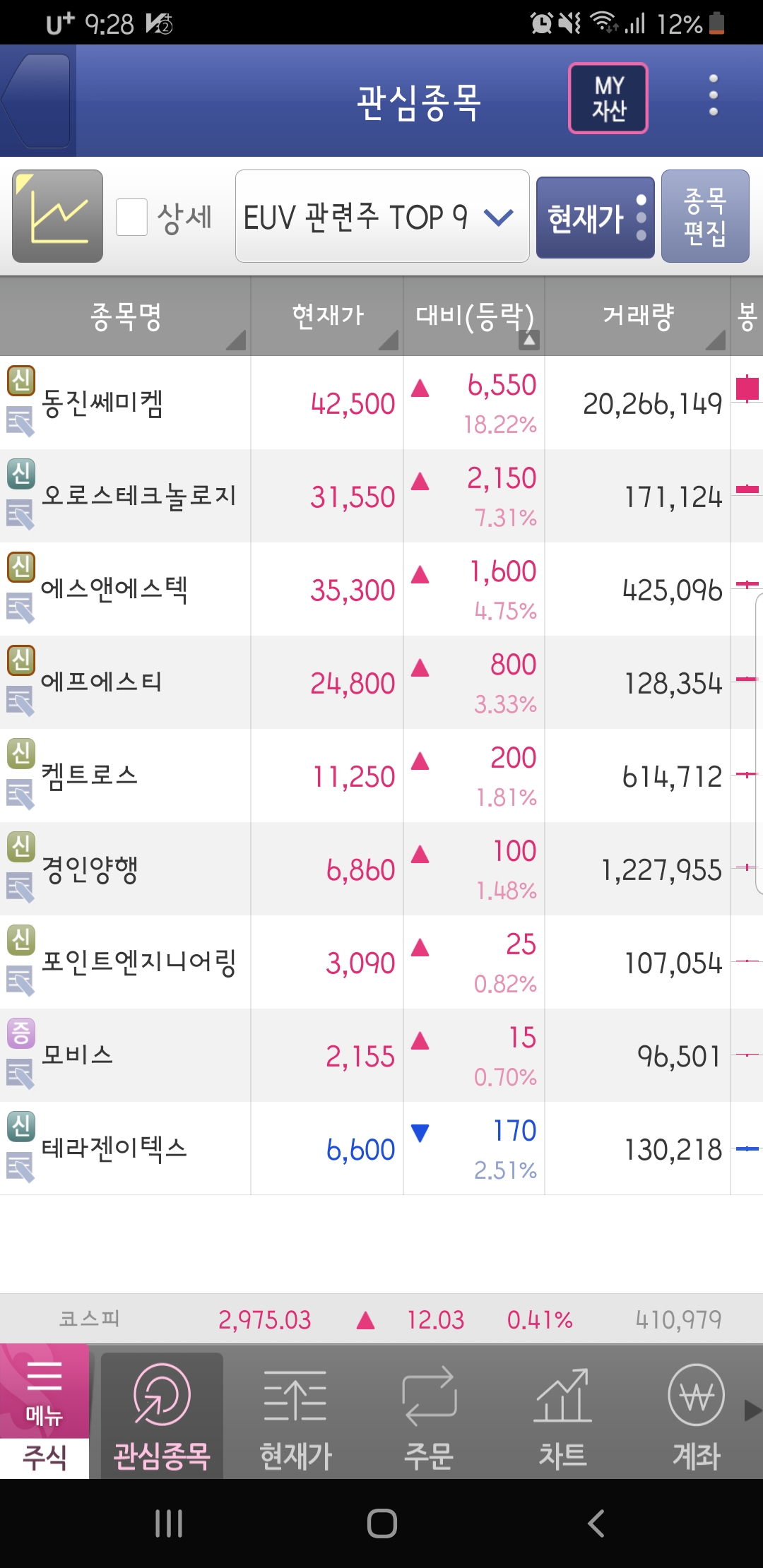 안녕하세요. 오늘은 동진쎄미켐 경인양행 에스앤에스텍 켐트로스 오로스테크놀로지 등 EUV 관련주를 살펴보겠습니다. 지난 2019년 일본이 수출 규제 품목으로 정한 3가지 소재 가운데 하나인 EUV PR은 기술 난도가 높아 전량 해외에 의존해온 제품이었습니다. 특히나 고성능 반도체 칩을 만들 때 필수적이며 수요가 지속적으로 늘어나고 있는데 국내 기업 간 협업으로 국산화에 성공했습니다. 이게 EUV 관련주들이 연일 강세를 보입니다.