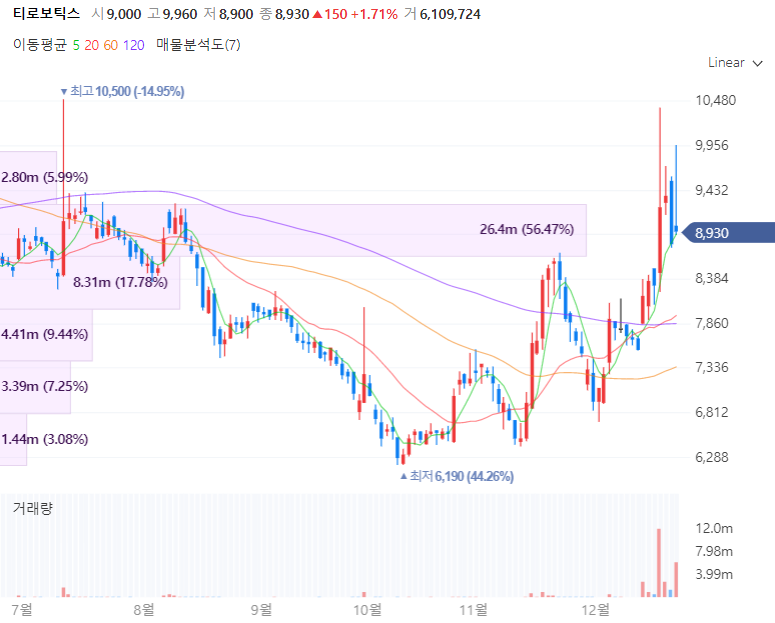 티로보틱스는 2004년 설립된 진공로봇 전문기업으로 최근에는 자율주행과 의료재활 분야에 대비한 종합로봇기업으로 성장하고 있습니다. 티로보틱스는 진공로봇사업분야의 사업기반을 바탕으로 의료재활로봇과 물류로봇, 푸드테크 로봇 등 로봇산업에서 성장가능성이 높은 분야의 로봇개발 강화를 위해 전 산업자원부 로봇 PD 이력을 지닌 박현섭 박사를 연구센터장으로 영입한 바 있습니다. 아울러 자체 개발한 자율주행로봇과 일본 ZMP 협력으로 확보한 자율주행솔루션을 개발중입니다.