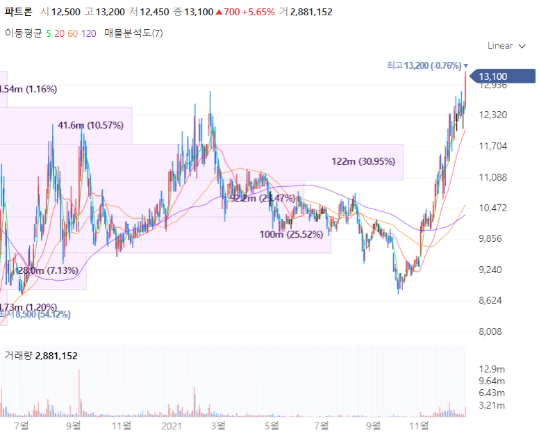 파트론의 주요 제품은 카메라모듈, 안테나 등이 있으며 국내외 핸드셋업체 및 통신시스템업체 등으로 공급중입니다. 파트론은 주요 고객사의 스마트폰 출하량이 줄어들었음에도 불구하고 플래그십과 대량 생산 모델인 A1, A3 시리즈 등에 공급하고, 전장 카메라 공급을 확대해 카메라 모듈 실적이 증가했습니다. 아울러 내년부터 매출이 발생할 웨어러블 ODM 사업 또한 새로운 성장 동력으로 작용할 것으로 전망됩니다. 2021년 결산배당으로 주당 350원 현금배당을 결정했으며 애널리스트들의 실적 전망을 살펴보면 올해 매출액은 1조3139억원으로 전년 대비 11.4% 증가하고 영업이익은 711억원으로 같은 기간 69.5% 늘어날 것으로 기대됩니다.