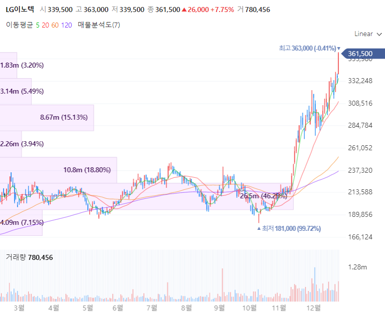 최근 LG이노텍의 광학솔루션 사업부문 실적이 아이폰13 판매량 호조에 따라 실적 예상치가 크게 상향되며 신고가를 갱신중입니다. LG이노텍의 광학부품과 전장부품이 애플의 메타버스 하드웨어 기기(XR)와 자율주행차(애플카)에 탑재것이란 전망이 나오고 있으며 메타버스 시장에서 기기에 들어갈 부품을 공급할 기대감 역시 크게 작용하고 있습니다. LG이노텍의 2021년 4분기 실적을 살펴보면 증권가에서는 매출액은 전년 대비 27% 증가한 4조8769억원, 영업이익은 34% 늘어난 4569억원을 기록할 것으로 예상합니다.