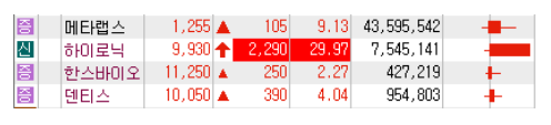 모발이식 관련주 메타랩스 하이로닉 한스바이오메드 덴티스 앤디포스 등