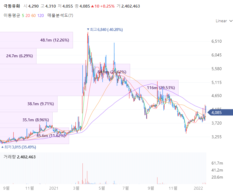 극동유화는 윤활유와 액화석유가스(LPG), 아스팔트 등을 제조하는 전문기업입니다. 극동유화는 석유 및 석유류 제품정제, 생산, 판매, 임가공 및 무역업, 석유화학 제품 원료 및 생산품의 수출입업 등을 영위하고 있으며 지난해 3월 한국타이어앤테크놀로지가 극동유화 지분 11.68%를 획득하며 2대 주주에 올라섰습니다.