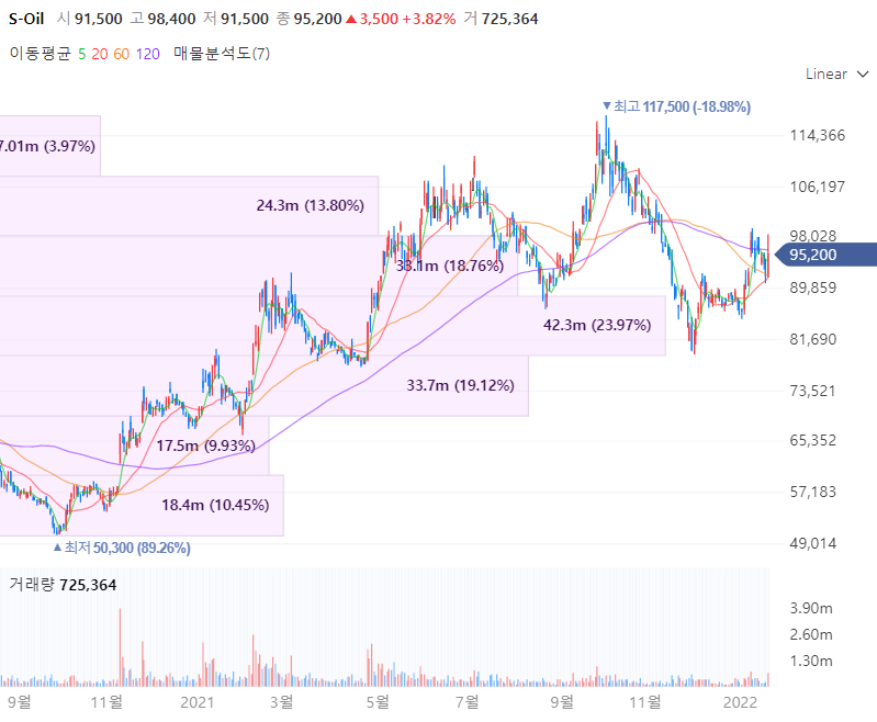 안녕하세요. 오늘은 S-Oil, 중앙에너비스, 흥구석유, 극동유화, 한국석유 등 석유 관련주를 살펴보겠습니다. 최근 영국 런던ICE선물거래소에서 브렌트유 선물 가격은 장중 한때 87.85달러까지 상승했고, 서부텍사스산원유(WTI)도 85.53달러까지 가파르게 상승하며 2014년 10월 이후 가장 높은 가격을 보입니다. 전문가 의견에 따르면 올해 유가는 100달러를 돌파할 것이란 전망도 나오며 마진이 개선되는 석유 관련주들이 부각받고 있습니다.