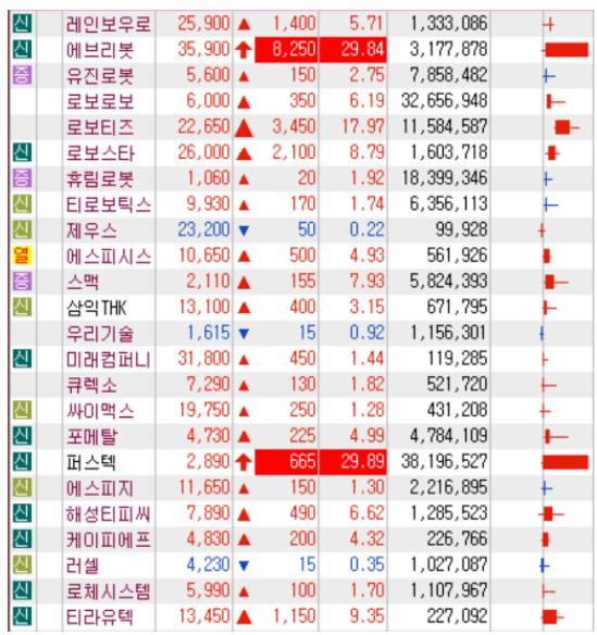 안녕하세요. 오늘은 등 재활로봇 관련주를 살펴보겠습니다. 1월 26일 윤석열 국민의힘 대선후보가 재활로봇 보행치료 활성화를 위한 지원 확대를 밝혔습니다. 구체적으로 석열씨의 심쿵약속 21번째로 재활로봇을 활용한 보행치료 의료수가를 상향하고 건강보험 적용 확대를 발표했습니다. 로봇을 활용한 의료 재활에 대한 수요가 높고 관련 인프라 시장도 확대되고 있지만 장비 가격이 높아 정작 필요한 환자들의 이용이 불편한 상황이지만 향후 로봇 관련분야 연구와 산업에 대한 지원책을 내놓아 재활로봇 관련주들이 부각받고 있습니다.