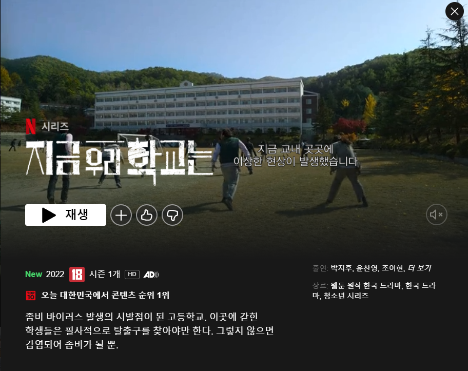 안녕하세요. 지난 1월말 공개한 넷플릭스 오리지널 지금 우리 학교는이 글로벌 시청률 1위에 올라섰습니다. '오징어게임' '지옥' '고요의 바다' 등 한국 오리지널에 이어 네 번째 1위 작품으로 동명 네이버웹툰 지식재산(IP)을 영상화한 K-좀비 콘텐츠입니다. 영국 가디언에서는 한국 괴물 시리즈로 세계를 뒤흔드는 불길한 실존주의를 그린 최고의 작품이라는 평을 비롯해 미국에서는 악몽 같은 공간적 배경을 최대한 활용, 다른 세상에 있는 듯 현기증 나는 효과라는 긍정적인 평가가 이루어지고 있습니다. 다시 한번 한류 콘텐츠 흥행을 이끌며 지금 우리 학교는 관련주가 부각받고 있습니다.