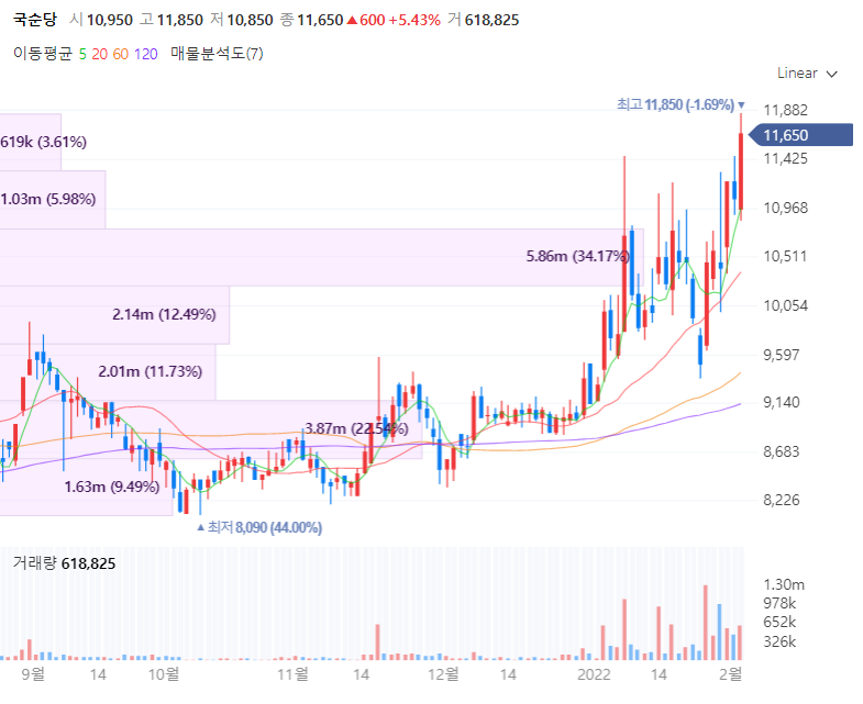 국순당은 백세주 및 국순당생막걸리 등 판매하고 있는 기업으로 지난해 12월 ‘국순당 쌀막걸리’를 비롯한 주요제품 가격을 9.9~25.0% 인상했습니다. 실제 가격 인상에 따른 수익성 개선 효과가 기대되며 국순당의 실적을 살펴보면 난해 3분기까지 누적 수출 83억2000만원을 기록했습니다. 이에 증권업계에서는 지난해 사상 최대 규모의 수출을 기록한 것으로 전망하고 있습니다.