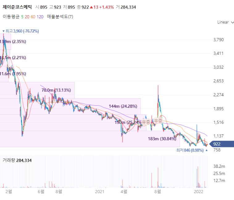 제이준코스메틱은 국내 외에서 화장품 제조 및 판매 등을 주요 사업을 영위하며 최대 주주는 제품을 중국으로 유통시키는 에프앤리퍼블릭입니다. 제이준코스메틱은 마스크팩 제조 공장을 물적분할로 양도하고 OEM형태로 제품을 생산하며 주요제품으로는 블랙 물광 마스크, 인텐시브 샤이닝 마스크, 웨이크퓨어 시소 카밍 마스크등이 있습니다. 동사는 지난 9월 ‘2021 올해의 브랜드 대상’에서 중국 현지 온라인 및 모바일 투표를 통한 중국 소비자가 뽑은 올해의 마스크팩 분야에서 5년 연속 1위로 선정되며 인지도가 높습니다.