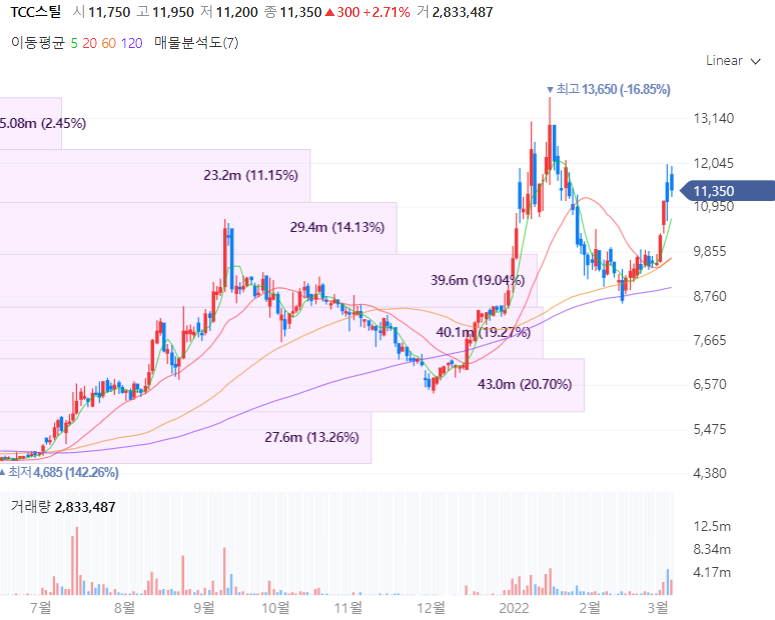 TCC스틸은 전기주석도금강판, 전기니켈도금강판 등을 생산하는 표면처리강판 전문제조업체입니다. TCC스틸은 2차전지 원통형 캔 소재인 배터리 포장재를 생산하며 가공 업체를 통해 국내 셀업체에 납품중입니다. 동사의 지난해 매출액과 영업이익은 각각 전년비 24.3% 늘어난 5367억원과 전년비 2536.4% 증가한 256억원을 기록했습니다. 아울러 760억원 규모의 니켈 도금 강판 수요증가에 따라 설비를 증설하며 활발히 사업을 영위중입니다.