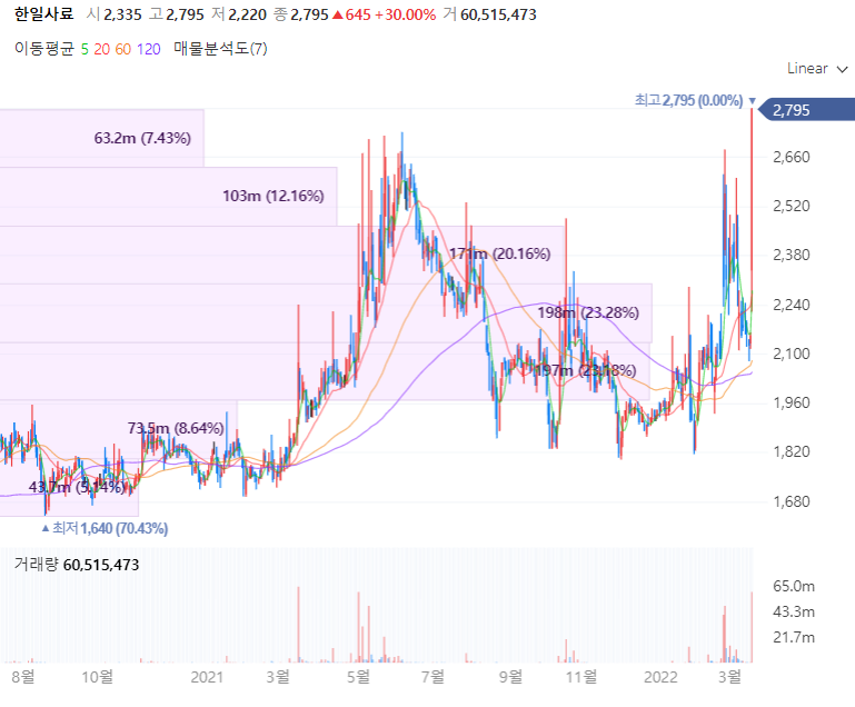 안녕하세요. 오늘은 한일사료 현대사료 대주산업 팜스토리 미래생명자원 등 사료 관련주를 살펴보겠습니다. 러시아의 우크라이나 침략으로 전세계가 식량 안보에 대한 위협을 느끼고 있습니다. 최근 캐나다 서부 세계 비료업계 칼륨비료 원료 탄산칼륨이 생산되는데 한국까지 운송되는 것을 맡는데 각국 사료 생산이 차질이 되면서 가격 상승 수혜가 예상되며 사료 관련주가 강세를 보입니다.