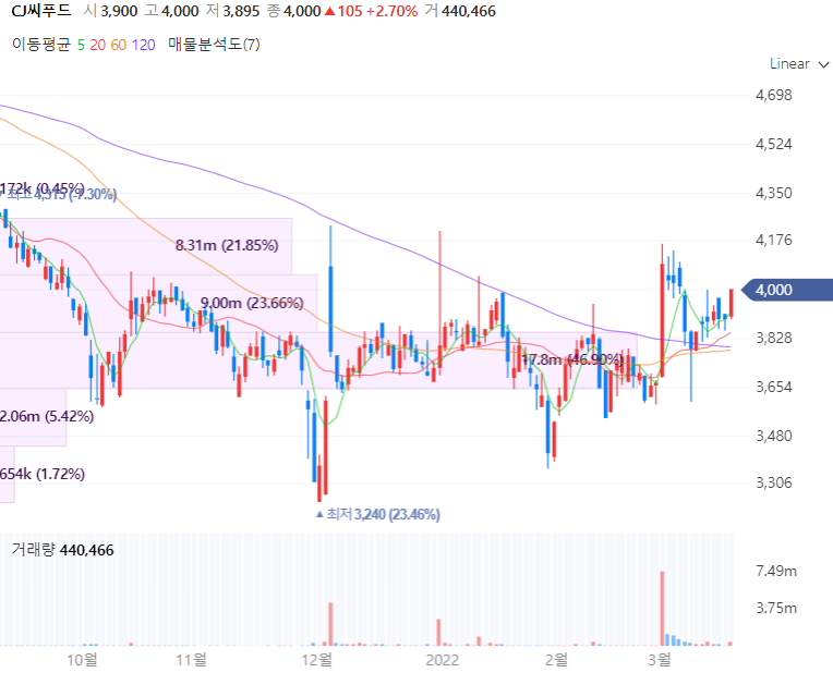CJ씨푸드는 삼호물산 주식회사로 시작해서 CJ제일제당의 판매네트워크를 통해 어묵, 맛살, 햄, 김 등을 생산 판매하는 전문 기업입니다. CJ씨푸드는 제품차별화 및 끊임없는 신제품 개발과 소비자 지향적인 마케팅 전략을 구사하며 활발히 사업을 영위중입니다. 동사의 실적을 보면 지난해 연결 기준 영업이익이 전년보다 13.5% 늘어나 44억9900만원 같은 기간 매출액은 1621억4300만원으로 8.8% 늘었습니다.