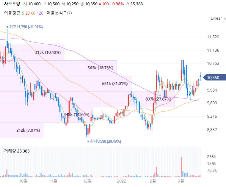 사조오양은 식품제조, 원양어업 등 업계 최초로 맛살 제품을 국내 공급하는 등 식품제조, 수산물, 기타부문등 으로 사업영역을 영위합니다. 사조양의 어묵, 햄, 수산물, 런천미트 등 제품은 영업본부를 통한 판매 및 사조대림으로 공급되어 다양한 유통채널을 통해 판매됩니다. 동사의 재무상태를 보면 매출은 3년 연속 3100억대 이상인 반면 시총이 900억대로 pbr은 0.4~5 수준으로 굉장히 낮은 수준입니다. 아울러 영업이익은 200억원대로 장부가치로만 보면 저평가임을 알 수 있습니다.