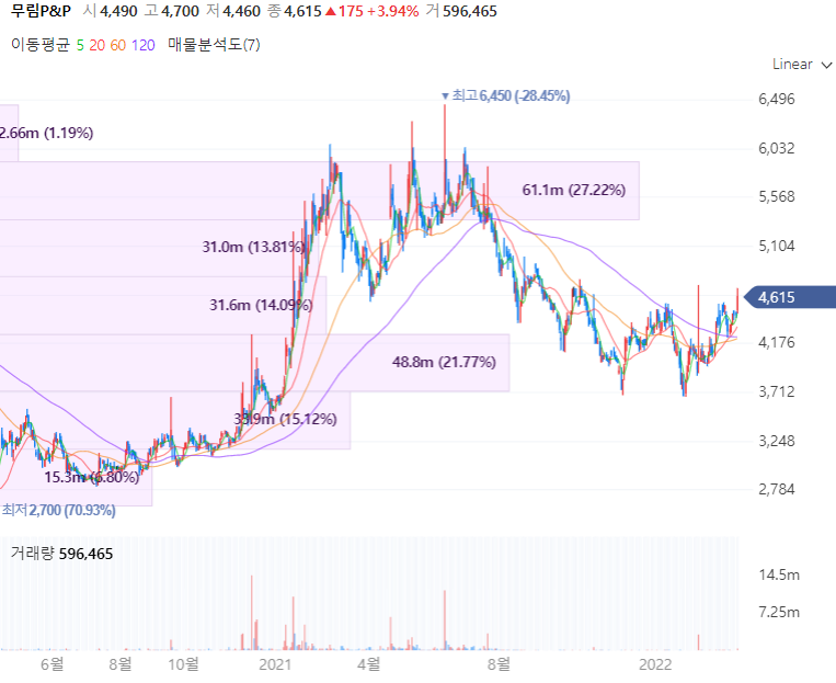 무림P&P는 국내 유일의 표백화학펄프 제조업체로 펄프-제지 일관화공장을 완공해 아트지, 백상지 등 인쇄용지를 생산하여 국내외에 판매 유통합니다. 무림P&P는 인도네시아에서 조림사업 진행으로 부각된 바 있으며 지난 7일 매출액대비 13.5% 규모로 계열회사인 무림페이퍼, 무림SP와 712억4770만8000원 규모 활엽수 표백화학펄프 공급계약을 맺는 등 실적이 꾸준히 발생합니다. 동사의 실적을 살펴보면 지난해 연결 기준 영업이익이 293억8671만원을 기록했고, 매출액은 6136억9911만원으로 각각 전년 동기 대비 365.4%, 16.3% 크게 증가했습니다. 아울러 동사는 시가배당률이 2.9%에 달하며 배당 매력까지 더해집니다.
