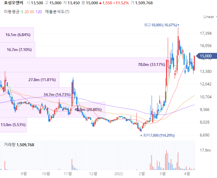 효성오앤비는 농협 계통 유기질비료 납품부문 선두 기업으로 유기질비료인 혼합유박(펠렛), 혼합유기질(펠렛), 유기복합(펠렛), 부숙유기질, 기능성 바이오제품등을 납품합니다. 효성오앤비의 제품 비료의 대부분의 판매는 농협을 통해 이루어지며 비료가격 또한 매년 농협과 공급가격을 체결하여 소비자인 농업인들에게 제공됩니다. 동사의 매출 구성은 유기질비료 62.62%, 상품 37.38% 등입니다. 요소대란에도 요소를 이용하는 비료의 가격도 급등함에 따라 관련주로 편입되며 지난번 26억5,200만원 규모의 자사주를 취득도 긍정적인 영향을 보입니다.