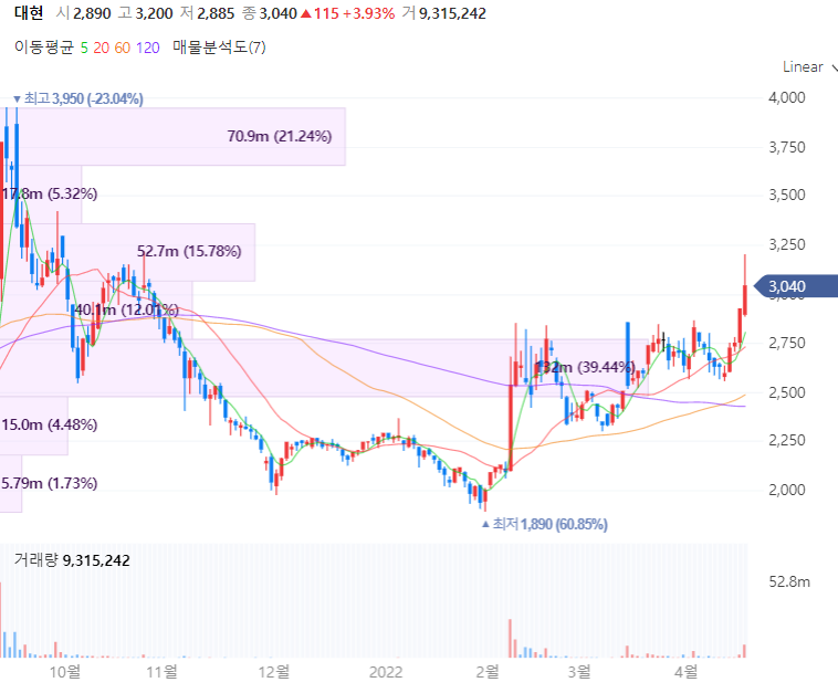 대현은 여성복 전문 제조 판매기업으로 국내 515여개의 백화점, 대리점, 상설점 등의 오프라인 유통망과 자사 온라인 쇼핑몰, 타사 온라인 오픈마켓 등 유통망을 보유합니다. 대현은 ‘모조에스핀’, ‘듀엘’, ‘블루페페’ 등 브랜드를 보유하고 있으며 의류부문 매출의 98.8%를 내수시장에서 유통되고 중국 직판계약 등을 통해 의류매출의 1.2%를 수출합니다. 증권가에서는 국내 의류 시장에서의 보복 소비로 인한 매출 반등 및 펀더멘털 개선될 것으로 전망하며 실적을 살펴보면 지난해 개별기준 영업이익이 224억1477만원으로 전년대비 214.3% 크게 상승했습니다.