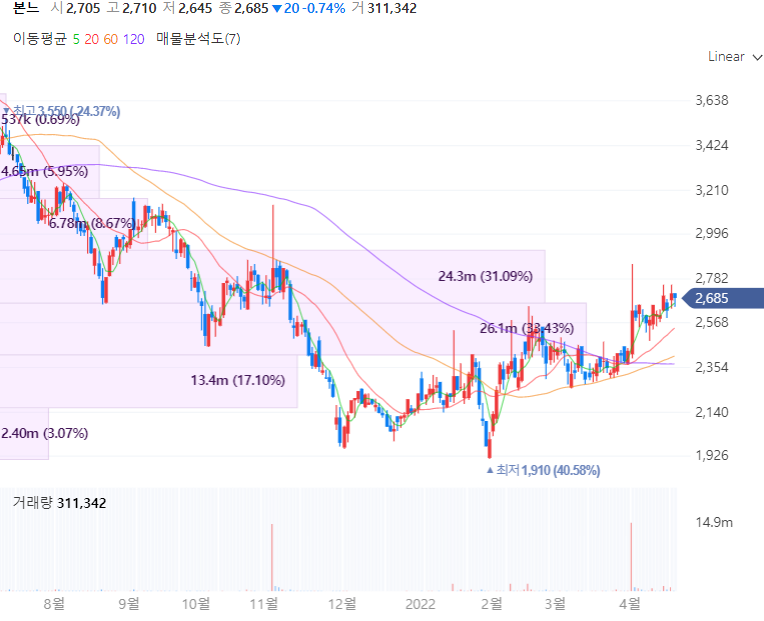 본느는 화장품 제조업체로 색조화장 브랜드 스테이지큐 보유하고 있으며 화장품 관련 ODM사업과 자체 브랜드사업에 중점을 둡니다. 본느는 특이하게 제조생산 시설없이 연구개발력을 바탕으로 제품을 자체적으로 개발 및 디자인해 제조회사에 제공하는 방식을 취합니다. 증권가에서는 지난 2월 신규 인수한 아토세이프의 수익성이 개선될 전망이 비추어지며 향후 플랫폼 및 마케팅 활성화에 따라 수익성 안정화가 기대됩니다.