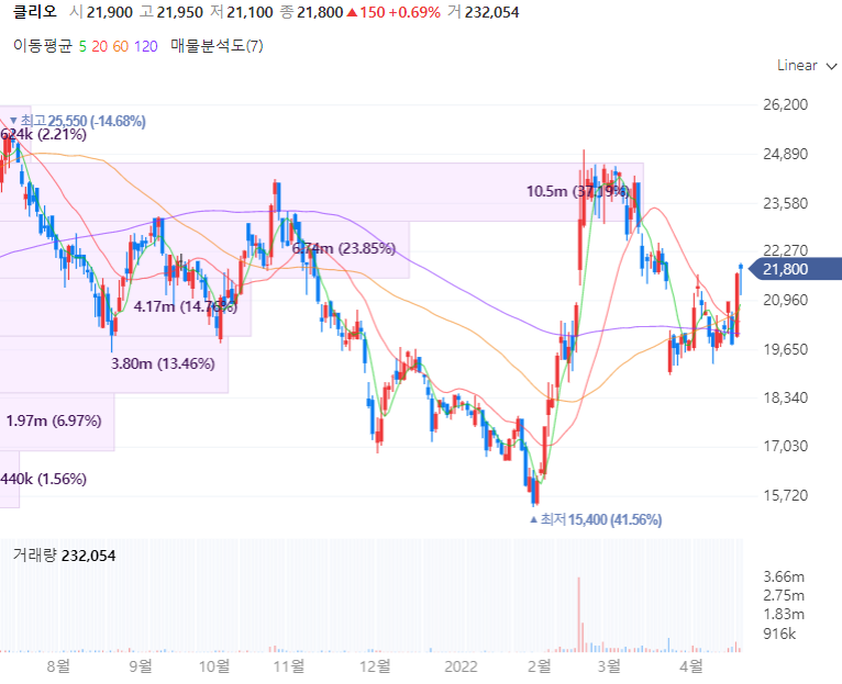 클리오는 색조화장품 전문업체로 화장품 및 화장도구의 판매 및 유통사업 등을 영위합니다. 클리오는 각각 색조 전문 브랜드인 클리오와 페리페라, 스킨케어 전문 브랜드인 구달, 헤어&바디 전문 브랜드인 힐링버드, 더마 코스메틱 전문 브랜드인 더마토리 5개 브랜드를 보유합니다. 내수와 수출 비중이 거의 비슷하게 나오며 증권가에 따르면 22년 1분기 클리오의 실적은 매출액 655억원, 영업이익 34억원을 기록할 것이란 전망이 나옵니다.