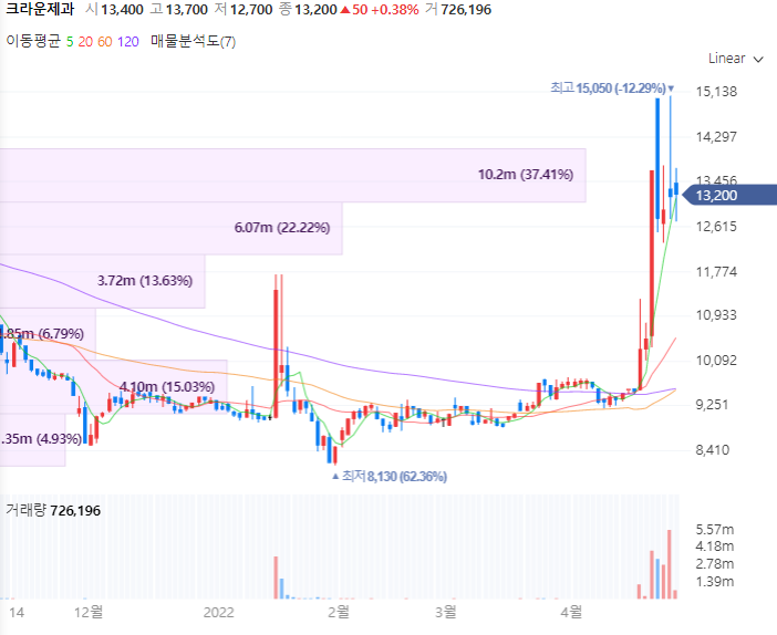 크라운제과는 크라운제과홀딩스가 영위하던 사업 중 식품제조 및 판매 사업을 중심으로 인적 분할 설립됐습니다. 크라운제과는 타 업체들과 함께 높은 시장점유율을 보이며 주요 4개 업체가 과점시장을 형성하고 있으며 초코하임, 쿠크다스, 뽀또, 미니쉘, 빅파이등이 주요 제품입니다. 동사는 국내에 총 3개의 생산공과 각 시군구의 물류창고들을 이용해 활발히 사업중이며 윤영달 회장이 윤석열 당선인이 같은 윤씨로 알려지며 관련주로 편입되기도 합니다.
