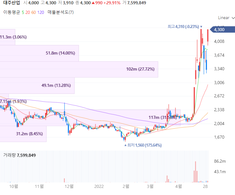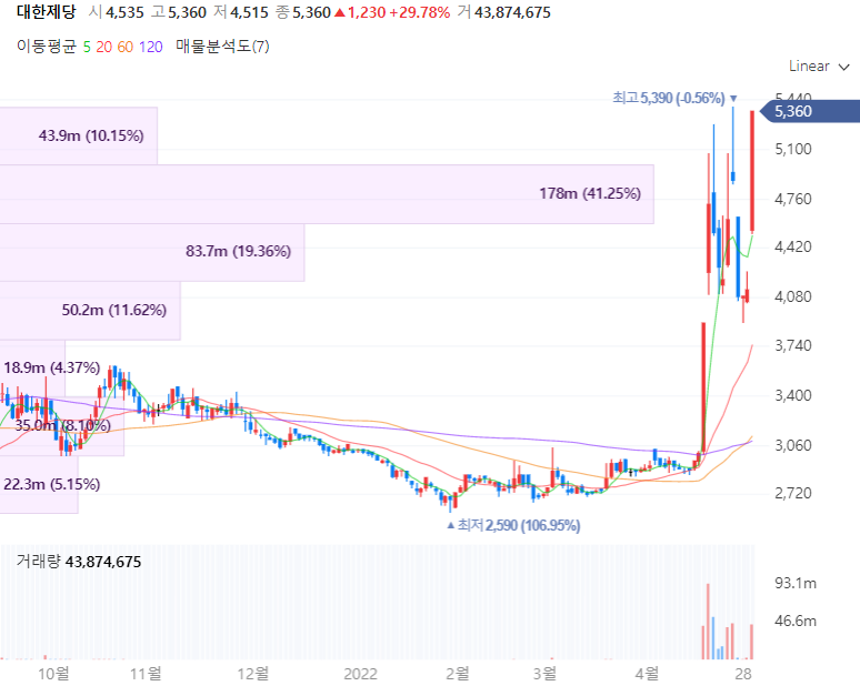 안녕하세요. 오늘은 대주산업 대한제당 팜스토리 한일사료 이지홀딩스 등 식량관련주를 살펴보겠습니다. 식량 수급 차질 문제가 장기화 되면서 곡물 가격 상승세가 꺾이지 않고 있습니다. 국제 원자재 가격의 고공행진이 오는 2024년 말까지 계속될 것으로 예상되며 특히 곡물 가격 상승은 2008년 이후 가장 큰 폭으로 오를 것으로 전망됩니다. 이애 정부가 물가 급등에 따른 식량안보를 위해 예산 5조를 마련하여 투입한다는 소식이 알려지며 식량 관련주가 연일 강세입니다.