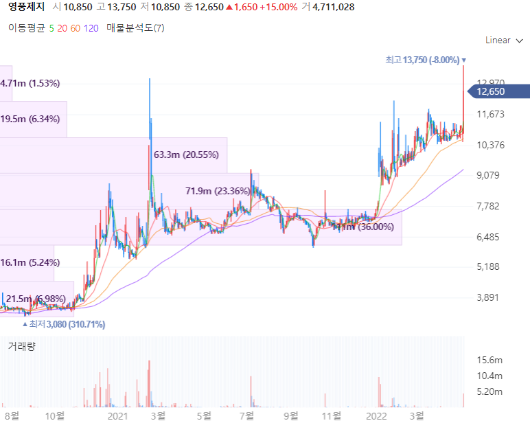 영풍제지는 골판지 원지 제조사로 화섬, 면방업계의 섬유봉, 실패의 원자재인 지관용원지와 골판지상자용 라이너원지를 전문 생산합니다.영풍제지의 실적을 살펴보면 지난해 연결 기준 매출액은 1206억원으로 전년대비 23% 증가했으며 영업이익과 당기순이익은 각각 81억원, 63억원으로 집계됩니다. 특히 2016년 이후 라이너지 연평균 매출은 534억원, 비중은 53.4%이며 동사의 고급 지관지 시장점유율은 약 50%로 지관지 원지 연평균 매출은 465억원, 비중은 46.6% 나타납니다. 최근 동사의 지분 매각에 따라 이슈가 되며 연일 주가가 고공행진입니다.