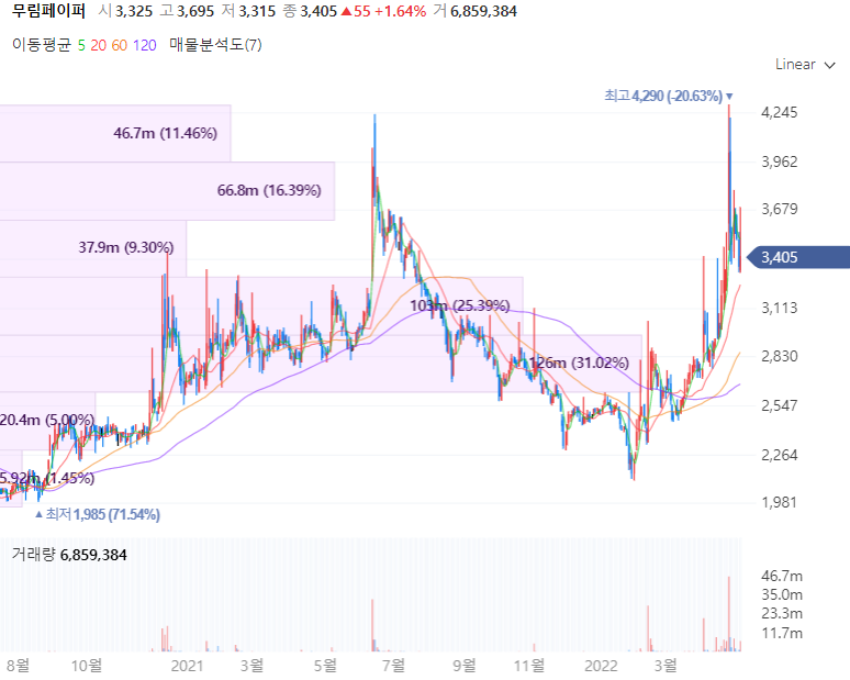 무림페이퍼는 잡지,캘린더,팝픔렛,쇼핑백 등의 아트지, 도서,노트류 등의 백상지 등 인쇄용지 전문 생산기업으로 무림파워텍, 무림P&P, 무림캐피탈, 대승케미칼 등을 자회사로 보유합니다. 무림페이퍼의 실적을 보면 지난해 연결기준 영업이익이 298억966만원으로 전년 동기 대비 9.3% 증가했으며 매출액 역시 전년보다 11.1% 늘어난 1조552억7326만원을 기록했습니다. 3월기준으로 미국 남부산혼합활엽수펄프 가격이 톤당 785달러로 전월 대비 16.3%, 지난해 말 대비 19.84% 상승하는 등 원자재 가격상승에 따라 제품 가격상승으로 동사의 실적이 더욱 상승할 것으로 기대됩니다.