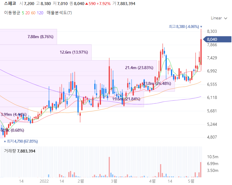 스페코는 특수목적용 건설기계제조 및 철구조물 제작 및 판매업 등을 영위를 목적으로 설립되어 철구조물 제작 및 판매업, 공해방지 시설업등을 영위합니다. 스페코는 기술개발 및 가격대비 품질 비교우위를 통해 시장 점유율을 확대를 노리며 아스팔트 플랜트 사업을 시작으로 콘크리트 플랜트, 크러셔 등의 건설장비 사업을 활발히 진행합니다. 동사의 실적을 보면 연결 기준 지난해 영업이익이 전년 대비 76.6% 감소한 28억, 매출액은 전년 대비 31% 감소한 543억원을 기록했습니다.