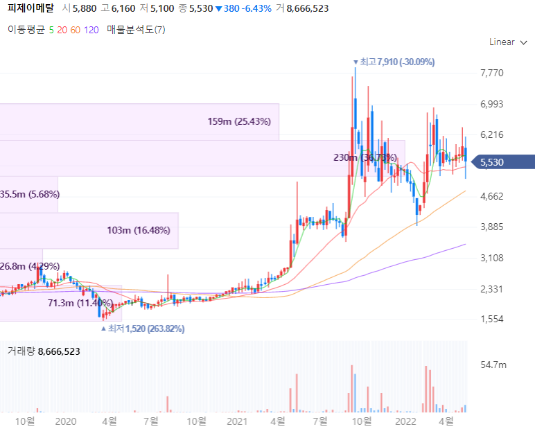 피제이메탈은 해외 및 국내에서 알루미늄 스크랩을 구매해 알루미늄 탈산제 및 빌렛을 전문 생산하는 전문기업입니다. 피제이메탈은 국내시장 점유율 48.1%로 포스코엠텍과 국내시장을 과점적으로 차지하며 알루미늄 6000합금 계열 생산라인에서 제품을 생산해 압출업체에 공급합니다. 동사의 실적을 보면 가격상승 및 원가 경쟁력 확보등으로 지난해 매출액 2462억원, 영업이익 252억원으로 전년대비 각각 92.1%, 290.8% 크게 상승했습니다.