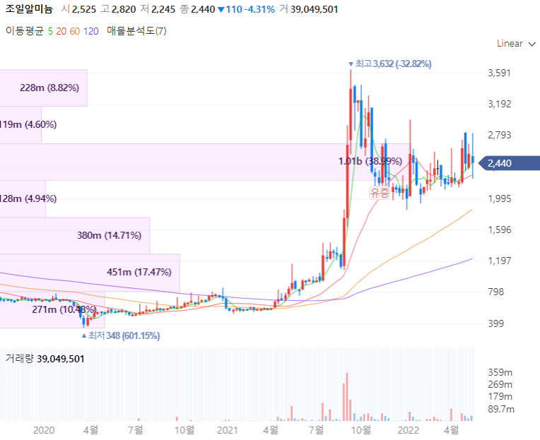조일알미늄은 알루미늄 생산 전문 기업으로 현재 폭 1,750㎜의 광폭 압연제품을 생산해 각종 건축 내장 및 외장재, 자동차용 소재, 방음벽재, 인쇄판, 보온재, 화장품 Cap, 전자부품, 주방용기 등의 소재등을 제조합니다. 조일알미늄은 지난 1월 1595억원 규모로 롯데알미늄과의 2차전지 양극박 소재 공급계약을 체결하는 등 2차전지 사업으로 영역을 확장하며 밸류에이션이 높아졌습니다. 동사의 실적을 살펴보면 지난해 연결기준 매출액은 4669억3250만원으로 40.3% 증가했으며 영업이익이 182억7923만원으로 전년대비 흑자전환에 성공했습니다.