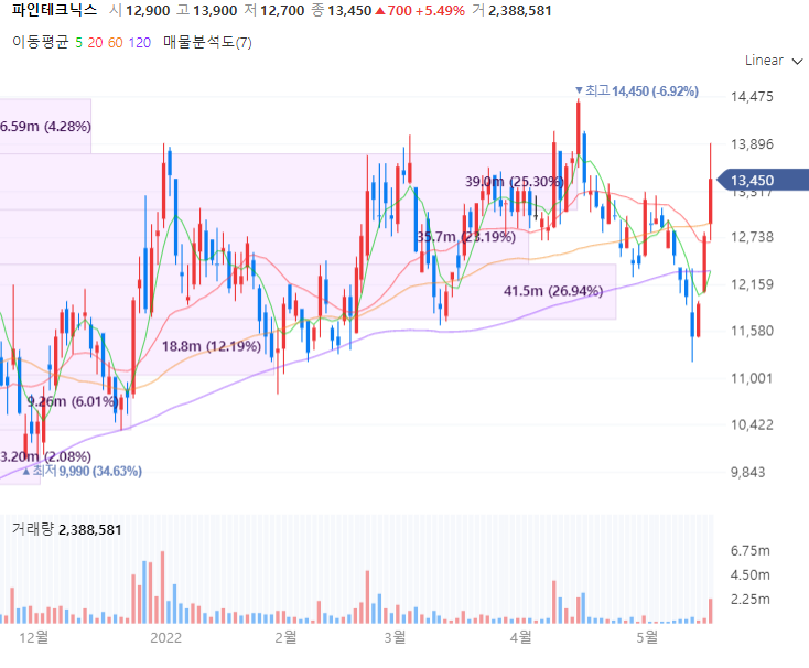 비에이치는 FPCB(연성인쇄회로기판) 전문 기업으로 삼성전자, LG전자, 삼성디스플레이 등 국내 대형사를 비롯해 다양한 고객을 보유합니다. 비에이치는 최근 LG전자 차량용 휴대폰 무선 충전사업 부문을 인수하며 사업을 확장했으며 실적을 살펴보면 올해 1분기 영업이익이 223억8600만원으로 전년 동기 대비 흑자전환 했으며 매출액은 3662억3500만원으로 163.9% 증가했습니다. 증권업계에 따르면 아이폰13의 디스플레이 세부 사양이 상향으로 판가가 상승과 경쟁사 사업 철수 반사 수혜 등으로 올해 2분기 기준 역대 최고 실적을 갱신할 것으로 전망되며 목표가는 4만원으로 상향된 바 있습니다.